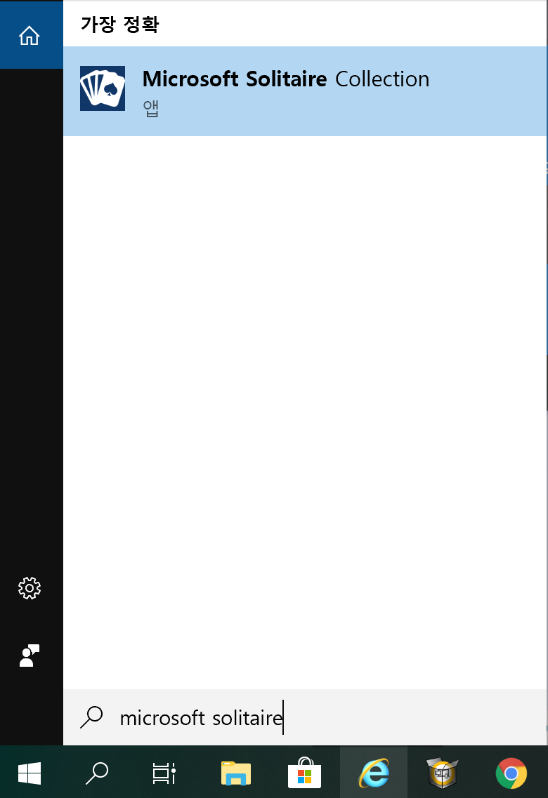 마이크로소프트 윈도우 10에서 카드 게임을 하고 싶다면, 다음과 같은 방법으로 찾아서 하면 된다. 예전에 마이크로소프트 윈도우에 왜 게임을 넣었냐며 라이센스 비용에서 게임 값만큼 빼 달라는 고객이 있었다는 얘기를 들었는데... 그래도 아직도 기본 설치가 되어 있다.