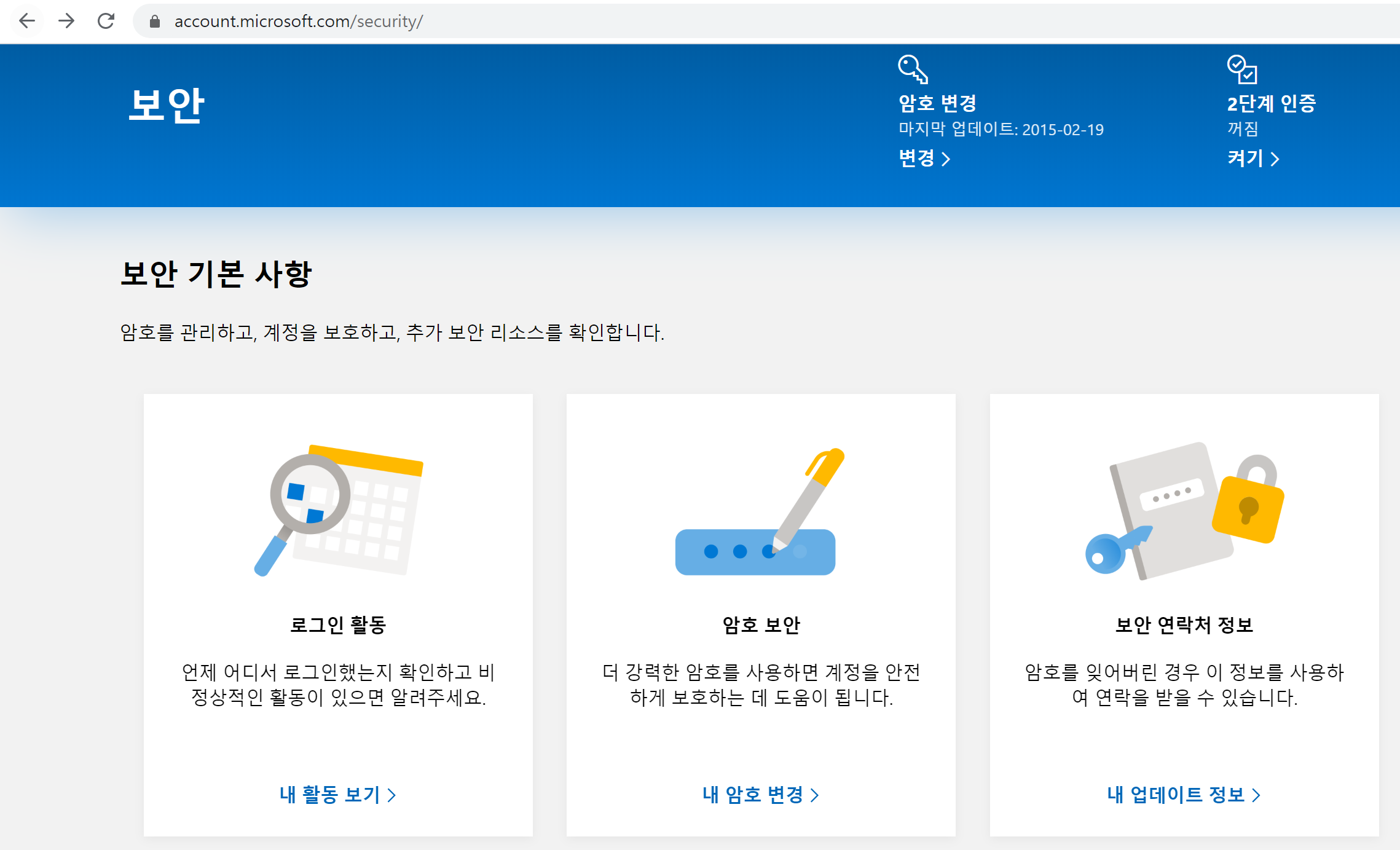 마이크로소프트 계정을 사용하다 보면, 2단계 보안 혹은 계정이름 (아이디), 비밀번호 등을 잊어 버렸을 때를 대비해서 추가 연락처 정보를 입력하도록 하고 있는데, 이를 관리할 수 있습니다. 방법은 아래와 같습니다.