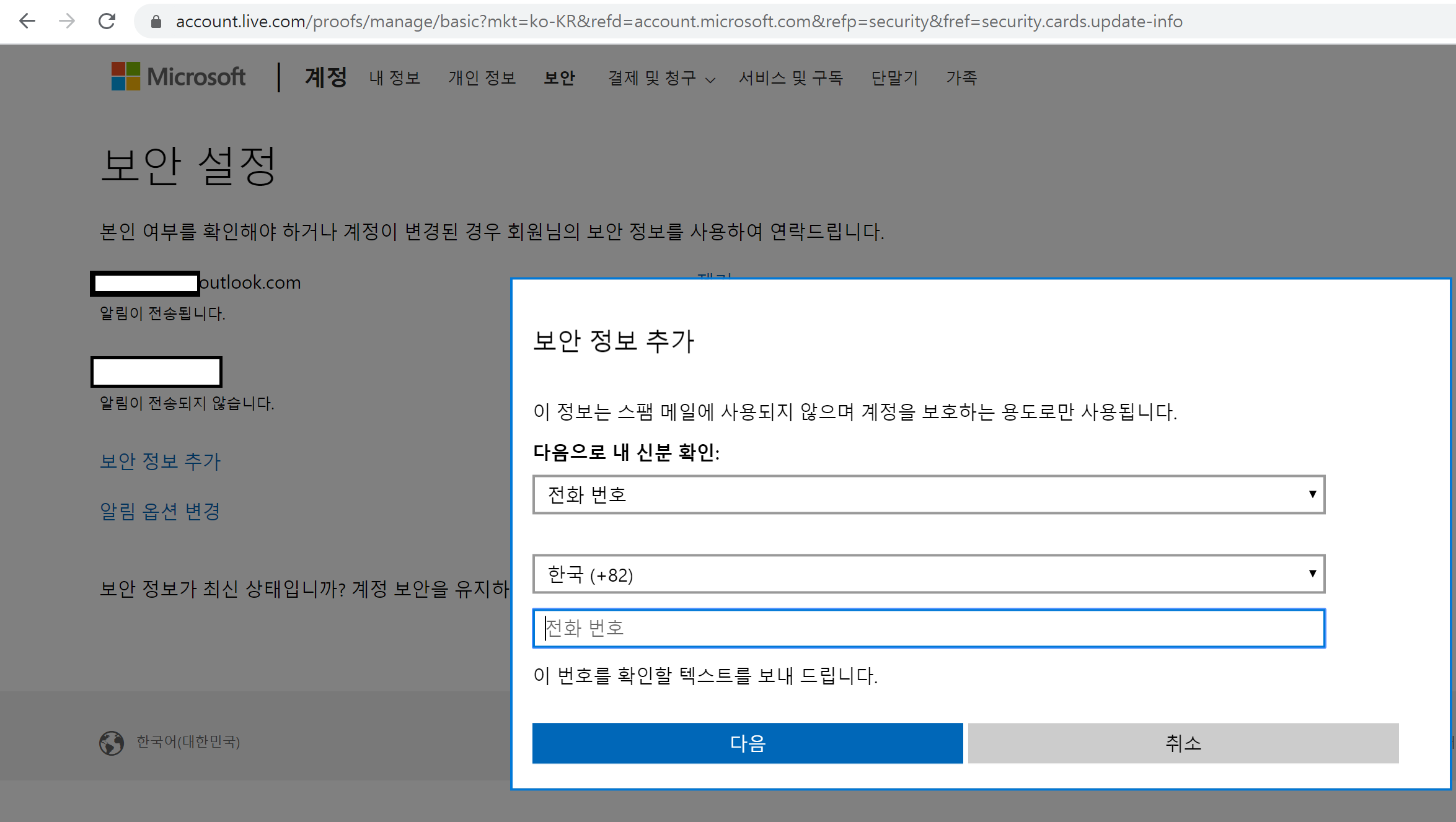3. 보안 정보 추가를 선택하면 아래와 같이 전화번호나 이메일을 추가할 수 있는 창이 나타남