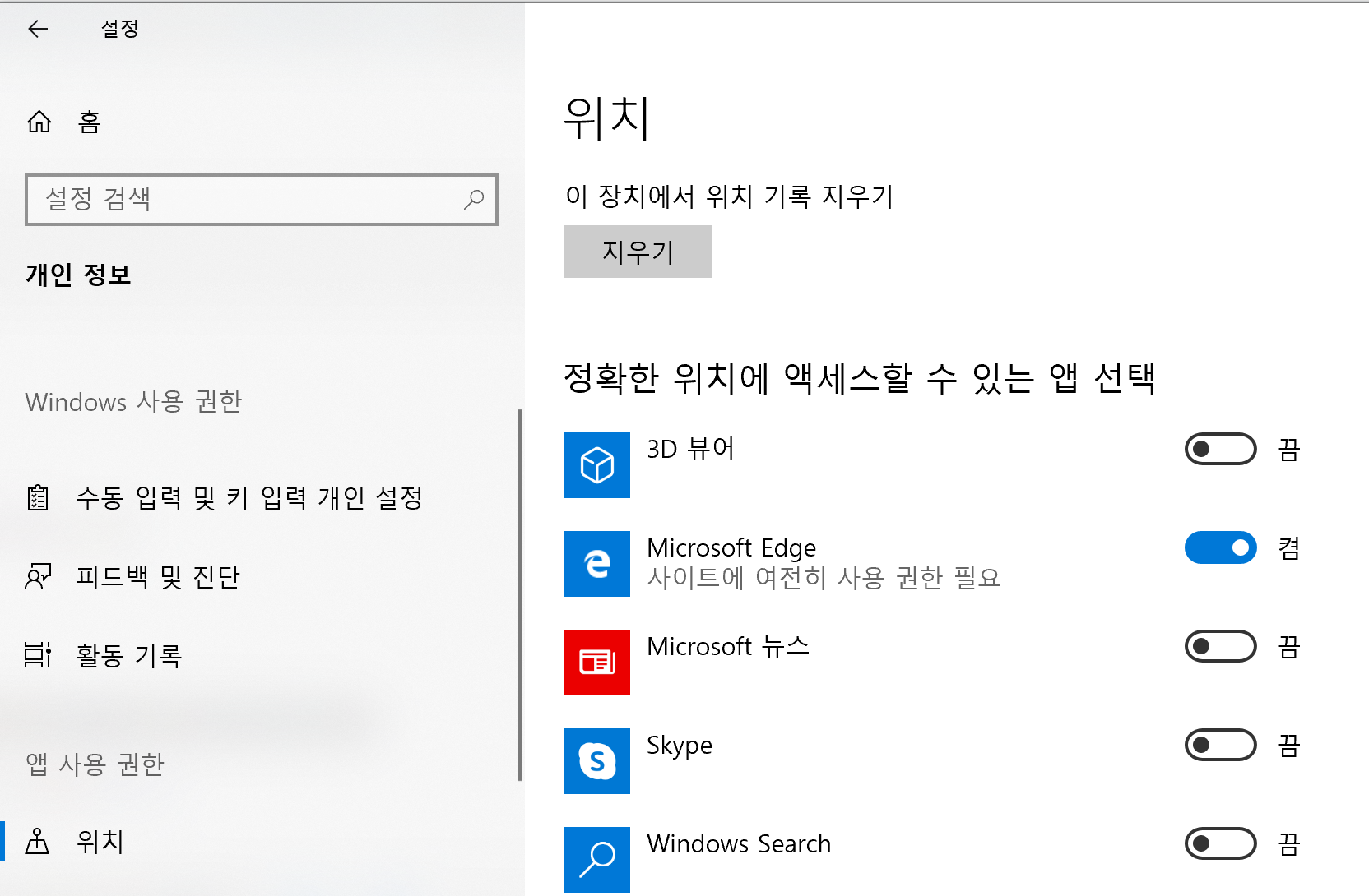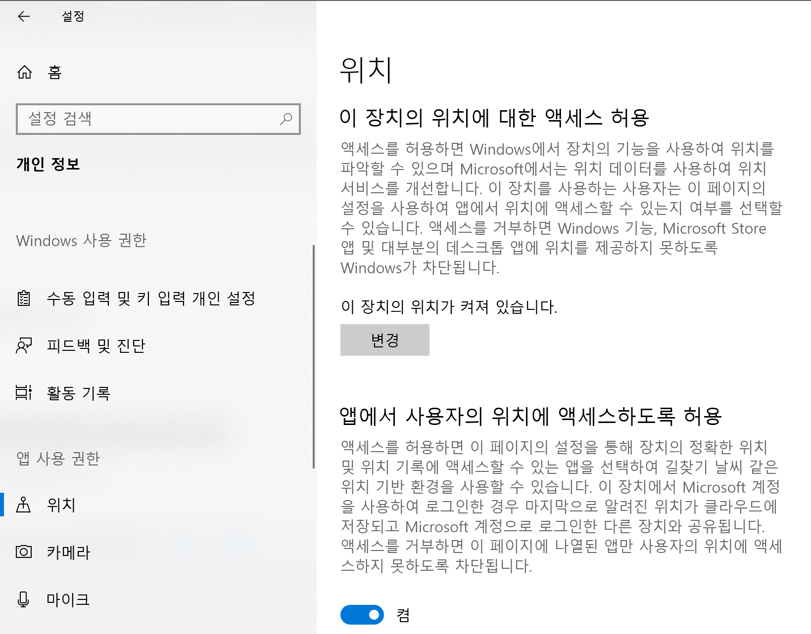 4. "이 장치의 위치가 꺼져 있습니다"라고 되어 있으면 "변경" 버튼을 눌러 켠다.