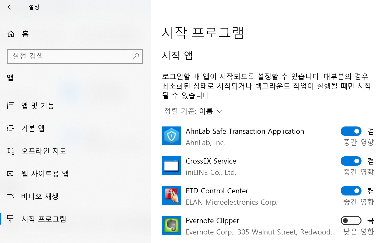 3. 왼쪽에서 시작 프로그램을 선택하고, 오른쪽에서 시작하고 싶지 않은 앱의 '켬'을 클릭하여 '끔'으로 설정한다.