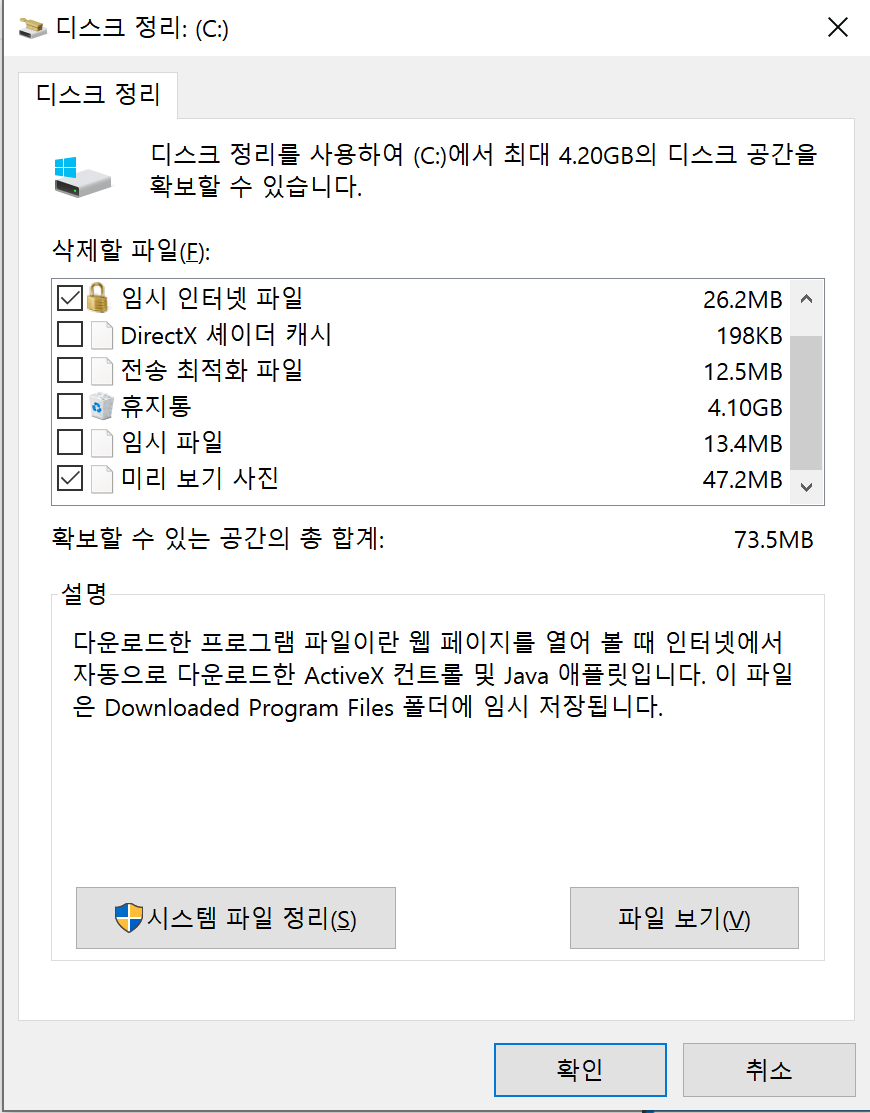 3. 다음과 같이 나타난 화면에서 삭제하고 싶은 항목을 선택하고 '확인'을 누르면 디스크 공간을 확보할 수 있다.