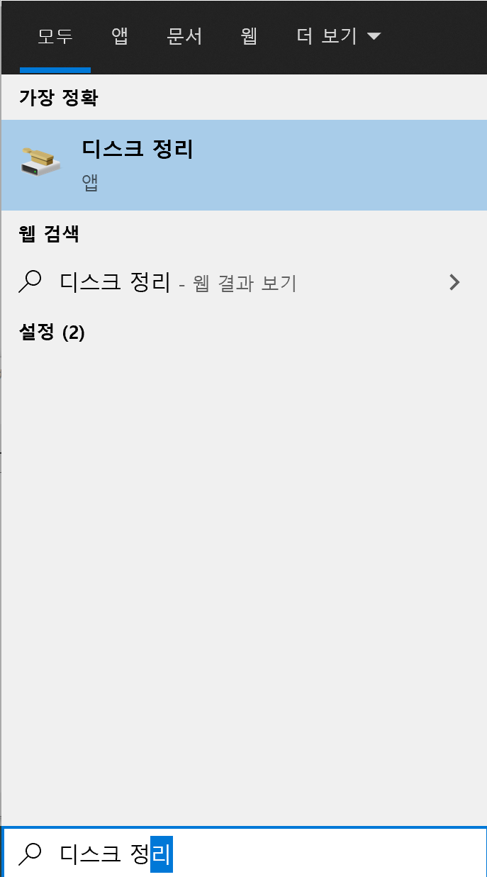 2. 검색 결과에서 '디스크 정리'를 선택한다.
