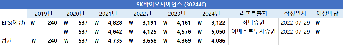 SK바이오사이언스 (302440) EPS / 배당 예상