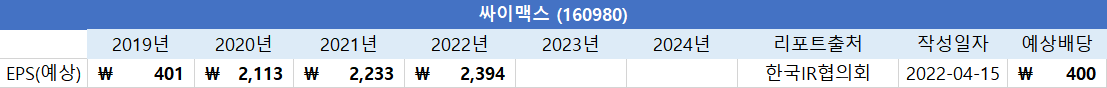 | 티플렉스 (081150) EPS / 배당 예상 (0) | 2022.04.16 |